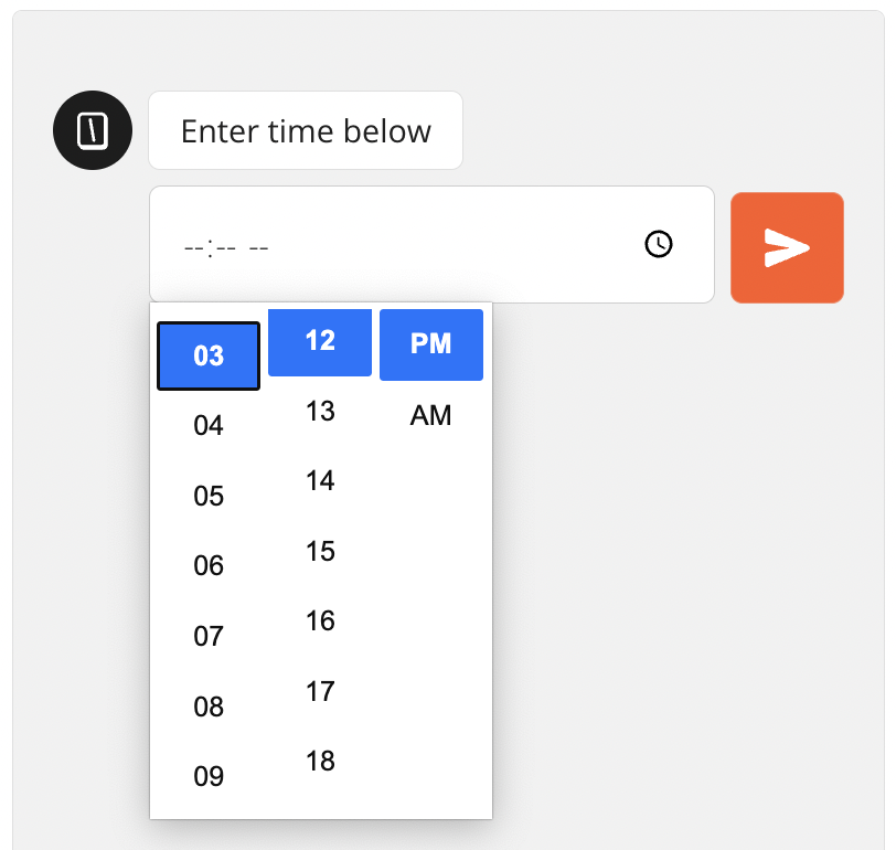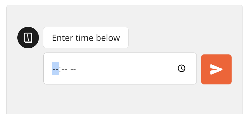 The input will use the native time picker depending on the device and browser used to answer the bot. For example on Chrome it looks like this: