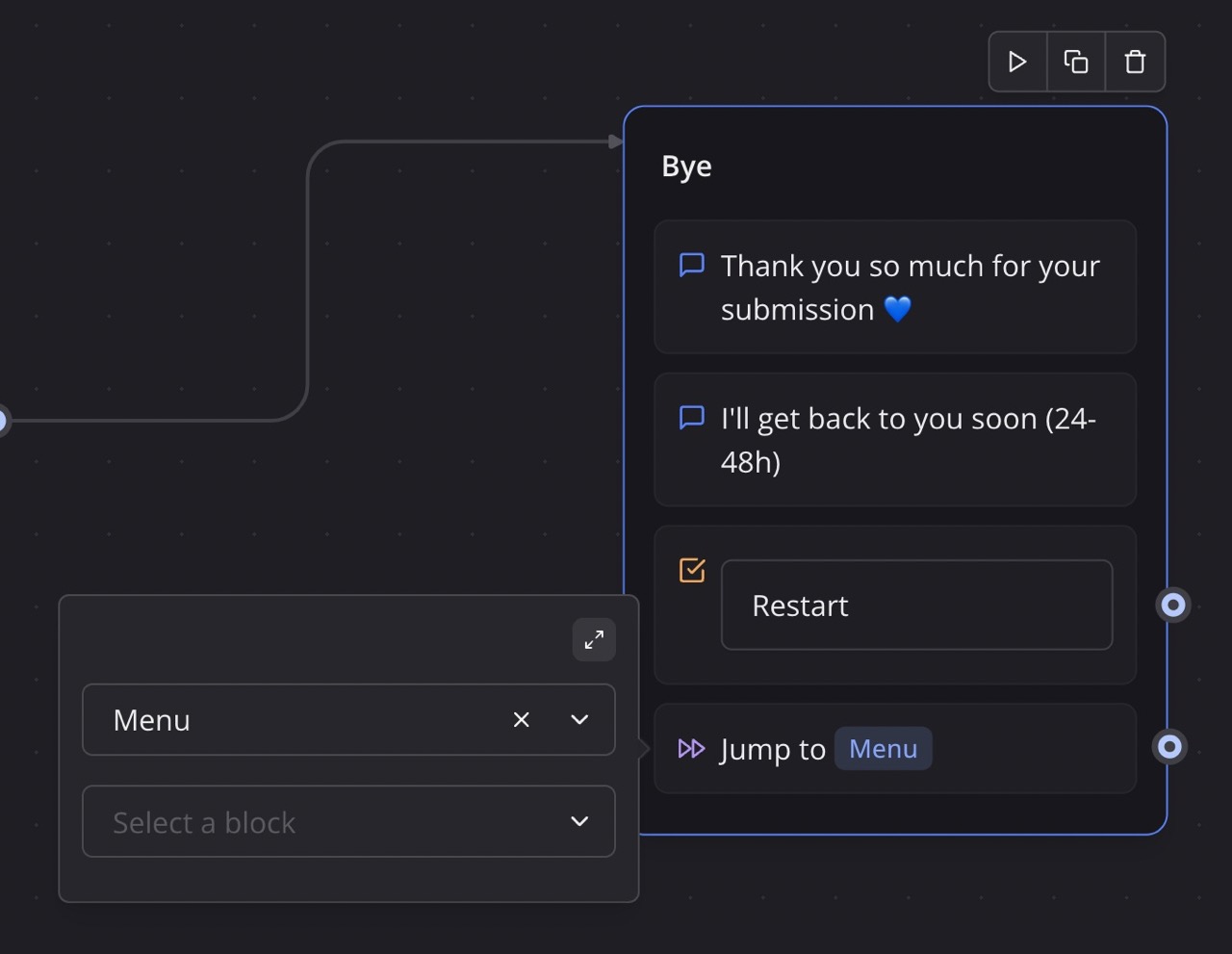 The jump block allows you jump to a specific block. This comes handy if you want to keep your flow clean