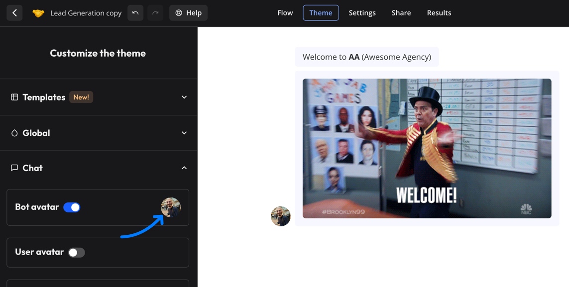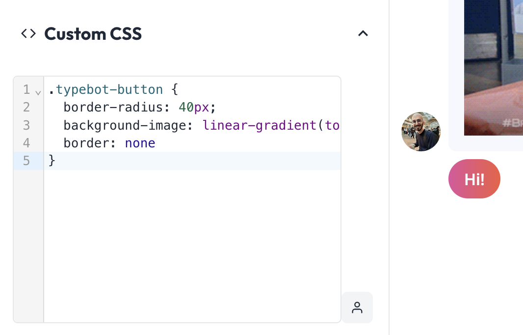 This section allows you to customize all the chats components (avatars, bubbles, inputs etc…). Click on the bot avatar to change the image:Custom CSS