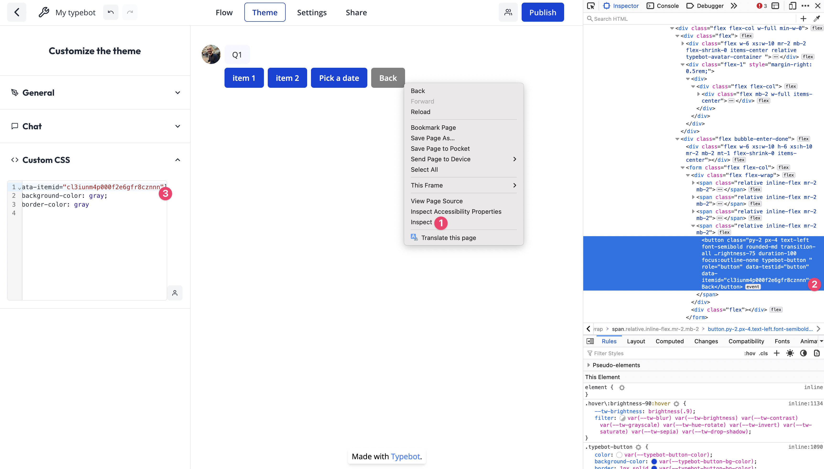 You can also decide to customize even further by adding any custom CSS you want. For this you right-click on the bot in the Theme page and inspect the element you want to customize: